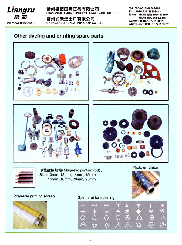 常州梁茹國際貿(mào)易有限公司是國內(nèi)外雙用鋏,T型刮漿片,感光膠, 640軸承,剝邊器,阿托斯滑塊,印花用漿泵,針板座, 印花用圓網(wǎng),印花圓筒網(wǎng),華磁棒,針板,毛刷輪,定型機(jī)鏈條, 切布刀片的主要供應(yīng)商 。我們公司位于常州市,臨近上海,交通十分便利。 我們注重產(chǎn)品質(zhì)量,價格優(yōu)惠,這是我們成功的原因所在,我司跟配套廠家緊密合作,不斷推出新產(chǎn)品,年銷售額逐年增加。我們的產(chǎn)品涉及化工、機(jī)械、紡織印染機(jī)械配件。我們熱忱歡迎國內(nèi)外客戶與我司洽談業(yè)務(wù),相信在我們的熱情服務(wù)之下能合作成功!