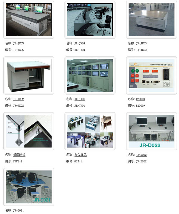 “久瑞”牌產(chǎn)品覆蓋:電子計(jì)算機(jī)、通訊網(wǎng)絡(luò)、公路交通、廣播電視、樓宇數(shù)控、電力輸配、教育設(shè)施、辦公設(shè)備。配套產(chǎn)品如監(jiān)控屏幕墻、控制操作臺(tái)、多媒體講臺(tái)、另外還有防靜電地板、屏風(fēng)隔墻、文件柜、辦公桌、更衣室、工作臺(tái)、工具箱、貨架、實(shí)驗(yàn)桌等。