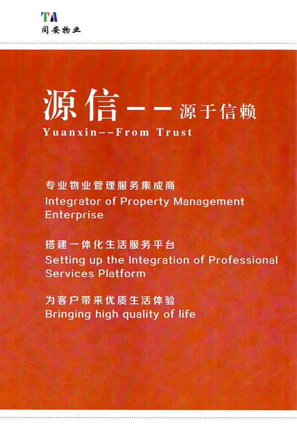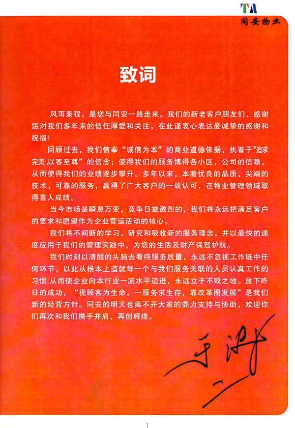 常州市同安物業(yè)管理有限公司注冊1999年,發(fā)展至今已有多年歷史,本公司坐落于美麗的龍城常州,秉承“融聚無限未來”的核心理念,融專業(yè)認(rèn)才,匯優(yōu)質(zhì)資源以”專心,細(xì)心,耐心”的服務(wù)態(tài)度,為客戶打造“安心,順心,稱心”的服務(wù)感受。 公司始終以“打造中國最值得信賴和最值得尊重的物業(yè)管理服務(wù)集成商”為愿景自我鞭策,不斷前行。同安物業(yè)以客戶滿意為終極目標(biāo),不斷加強(qiáng)”崗位資格認(rèn)證能力,人才招聘與職業(yè)化培訓(xùn)能力,產(chǎn)品策劃與管理設(shè)計能力,品質(zhì)監(jiān)督與管控能力,技術(shù)更新與運(yùn)營優(yōu)化力“五大專業(yè)能力的培養(yǎng)和提升,實現(xiàn)“精品化管理,專業(yè)化服務(wù)”。 公司發(fā)展至今,員工總數(shù)近千余人,大專以上學(xué)歷200多人,中高級技術(shù)人員160人,維修人員140人,物業(yè)管理師80名,公司接管面積達(dá)3100000多平方米,設(shè)涉及住宅小區(qū),別墅,大型游樂場,公園,醫(yī)院,廠區(qū),商業(yè)等。公司的工作管理逐步導(dǎo)入ISO9001質(zhì)量體系和ISO4001環(huán)境管理體系和GB/T28001職業(yè)健康安全管理體系,嚴(yán)格按照質(zhì)量體系的標(biāo)準(zhǔn)執(zhí)行。