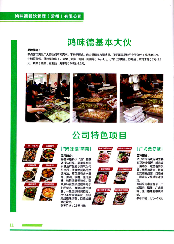 鴻味德餐飲管理(常州)有限公司是一家專(zhuān)門(mén)為企業(yè)單位、學(xué)校、醫(yī)院等提供伙食服務(wù)的企業(yè),以飯?zhí)玫某邪⑹卟、糧油配送為核心業(yè)務(wù),本單位管理規(guī)范化、專(zhuān)業(yè)化,實(shí)現(xiàn)管理嚴(yán)明,有較高的員工素質(zhì),不斷為消費(fèi)者創(chuàng)造更好的生活質(zhì)量。為了維護(hù)自身的品質(zhì)形象,我們已制定了一套完善的經(jīng)營(yíng)方式和管理制度:為健康、綠色生活提供保障!您的滿(mǎn)意是我們的目標(biāo),我們將竭誠(chéng)為您提供更好的品質(zhì)、更優(yōu)惠的價(jià)格、以及更優(yōu)質(zhì)的服務(wù)。