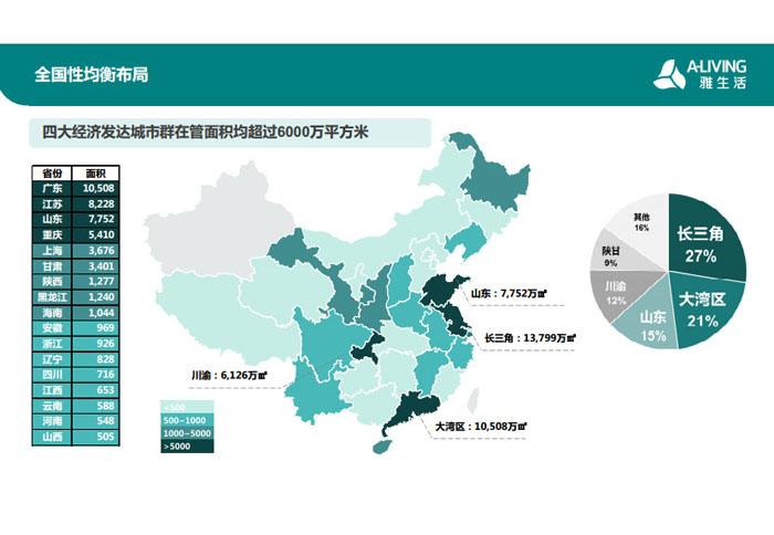一、立足北上廣,面向全中國(guó),走向全世界 1992年,雅居樂(lè)物業(yè)開(kāi)篇中山,率先引入港式物業(yè)管理模式。1997年,依托雅居樂(lè)地產(chǎn)的崛起,連續(xù)接管中山多個(gè)項(xiàng)目,成為高端大盤(pán)物業(yè)管理的領(lǐng)跑者。1999年,雅居樂(lè)物業(yè)開(kāi)啟專業(yè)化發(fā)展模式,全面通過(guò)英國(guó)皇家BSI的ISO9000質(zhì)量管理體系認(rèn)證,2001年成為國(guó)家首批一級(jí)物業(yè)管理資質(zhì)企業(yè)。 2002年,隨著廣州雅居樂(lè)花園的盛大啟幕,雅居樂(lè)物業(yè)邁開(kāi)向廣州進(jìn)軍的步伐。為尋求更長(zhǎng)遠(yuǎn)的發(fā)展,雅居樂(lè)積極構(gòu)思上市藍(lán)圖,2005年在香港成功上市。在深耕珠三角城市群的同時(shí),2006年雅居樂(lè)物業(yè)揮師北上,正式開(kāi)啟全國(guó)部署戰(zhàn)略。2008年,接管海南清水灣項(xiàng)目,揭開(kāi)旅游地產(chǎn)物業(yè)管理的新篇章。 接下來(lái)近十年里,雅居樂(lè)物業(yè)始終保持著最年輕的成長(zhǎng)姿態(tài),依托“管理數(shù)字化、服務(wù)專業(yè)化、流程標(biāo)準(zhǔn)化和操作機(jī)械化”的發(fā)展戰(zhàn)略,雅居樂(lè)物業(yè)榮膺2018中國(guó)物業(yè)服務(wù)百?gòu)?qiáng)企業(yè)第11名,2018年中國(guó)物業(yè)服務(wù)百?gòu)?qiáng)企業(yè)成長(zhǎng)性第二名、2018年中國(guó)物業(yè)服務(wù)百?gòu)?qiáng)服務(wù)質(zhì)量領(lǐng)先企業(yè)、2018年中國(guó)物業(yè)服務(wù)百?gòu)?qiáng)滿意度領(lǐng)先企業(yè)、2018中國(guó)物業(yè)服務(wù)百?gòu)?qiáng)經(jīng)營(yíng)績(jī)效領(lǐng)先企業(yè)、旅游地產(chǎn)物業(yè)管理領(lǐng)先品牌、2018年中國(guó)辦公物業(yè)管理優(yōu)秀企業(yè)(綠地物業(yè))、2017中國(guó)物業(yè)管理企業(yè)品牌價(jià)值第12名、2017中國(guó)物業(yè)管理企業(yè)綜合實(shí)力第12名、中國(guó)藍(lán)籌物業(yè)企業(yè)、《旅游地產(chǎn)物業(yè)管理服務(wù)標(biāo)準(zhǔn)》(團(tuán)體標(biāo)準(zhǔn))起草工作等多項(xiàng)殊榮。 目前,雅生活集團(tuán)已形成廣州、中山、深圳、南京、上海、西安、成都、海南、云南、北京、鄭州、南寧、沈陽(yáng)、武漢、馬來(lái)西亞十五大城市公司全面發(fā)展的蓬勃態(tài)勢(shì)。截止2017年12月31日,雅生活集團(tuán)管理范圍覆蓋全國(guó)逾69座城市與地區(qū),服務(wù)類型涵蓋主流住宅、高端豪宅、旅游地產(chǎn)、商業(yè)、寫(xiě)字樓等多種業(yè)態(tài),合約總建筑面積為12610萬(wàn)平方米,擁有200多個(gè)項(xiàng)目,服務(wù)業(yè)主逾100萬(wàn)人。 2017年6月,雅生活集團(tuán)收購(gòu)綠地物業(yè)100%股權(quán),并與綠地集團(tuán)簽署戰(zhàn)略合作協(xié)議,8月,綠地集團(tuán)投資10億元獲得雅生活集團(tuán)20%股權(quán)。未來(lái),雅生活集團(tuán)將實(shí)施“雅居樂(lè)物業(yè)”與“綠地物業(yè)”雙品牌驅(qū)動(dòng)戰(zhàn)略,還將尋求在A股上市,力爭(zhēng)打造中國(guó)物業(yè)“A+H”第一股。