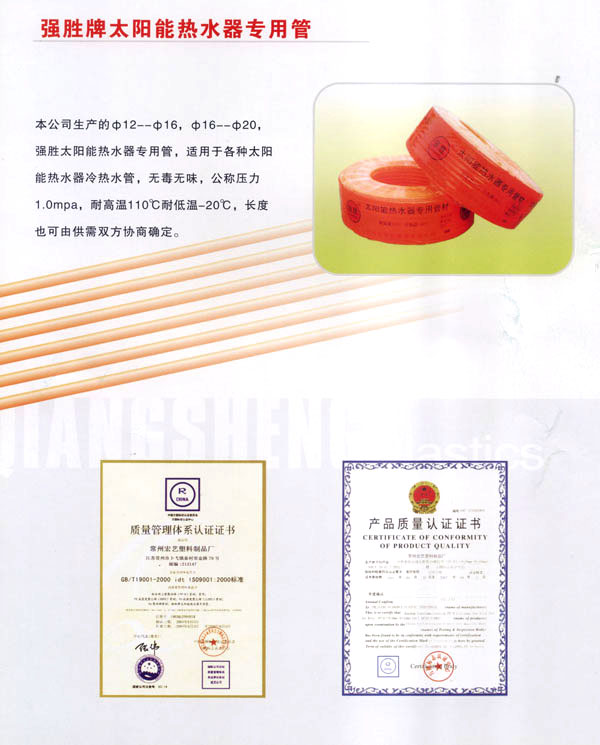 本公司是改革開(kāi)放初期成立的獨(dú)資私營(yíng)企業(yè)。二十余年來(lái),本廠在尊重 科學(xué)、尊重人才、加強(qiáng)技改、狠抓管理的基礎(chǔ)上使企業(yè)不斷地發(fā)展壯大。目前,本廠擁有22條先進(jìn)水平地單螺桿擠出機(jī)生產(chǎn)線,2條生產(chǎn)大口徑PP管地生產(chǎn)線,8臺(tái)電腦注塑機(jī),以及全套精密地檢測(cè)設(shè)備和高素質(zhì)地檢測(cè)人員,確保了產(chǎn)品質(zhì)量。年生產(chǎn)能力達(dá)6000噸,成為各種塑料管道地專(zhuān)業(yè)生產(chǎn)廠家。 我們的主要產(chǎn)品有: 給水用三型聚丙烯(PP-R)管材、管件;PE高密度聚乙烯(HDPE)管材;PE低密度聚乙烯(LLDPE)管材;PP聚乙烯管材;強(qiáng)勝牌太陽(yáng)能熱水器專(zhuān)用管。 產(chǎn)品廣泛用于城鄉(xiāng)水改、郵電通信、高壓供電、市政改造、路燈管理、鑿井挖泥、航道疏竣、選礦尾砂填充、環(huán)保、化工、輕工等行業(yè)。 本廠生產(chǎn)的各類(lèi)管材及管件,吸收國(guó)內(nèi)外同類(lèi)產(chǎn)品的精華,設(shè)計(jì)先進(jìn),結(jié)構(gòu)合理,選料科學(xué),質(zhì)量執(zhí)行國(guó)家標(biāo)準(zhǔn),產(chǎn)品歷年經(jīng)國(guó)家塑料制品質(zhì)量監(jiān)督檢驗(yàn)中心檢驗(yàn)合格。 我們始終秉承“以人品塑造產(chǎn)品”的理念,以科學(xué)提升品質(zhì)、與時(shí)俱進(jìn),以強(qiáng)大的研發(fā)能力,高質(zhì)量的提供新型的環(huán)保產(chǎn)品,回報(bào)社會(huì)各界的支持!